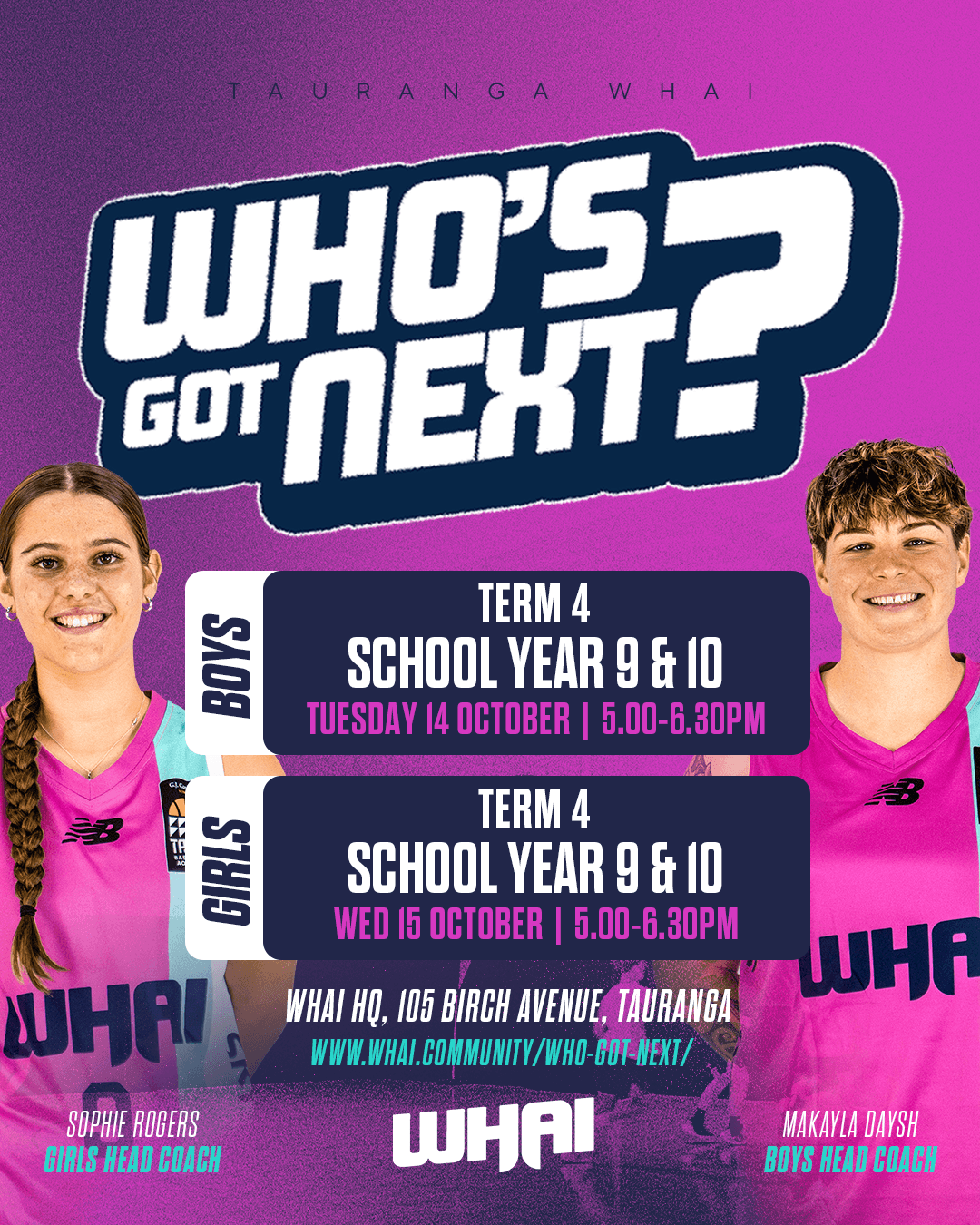 Whai’s Who’s Got Next? is our high-energy, high-impact development pathway designed for School Year 9 and 10 players, to identify and elevate the next generation of basketball talent from across the Bay of Plenty and beyond.